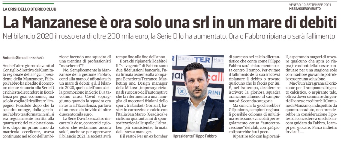 Nel bilancio 2020 il rosso era di oltre 200 mila euro, la Serie D lo ha aumentato. Ora o Fabbro ripiana o sarà fallimento clicca qui