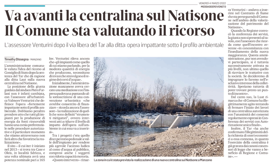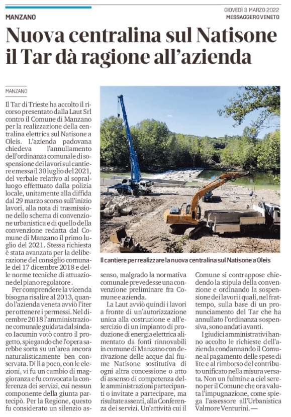 Il Tar di Trieste ha accolto il ricorso presentato dalla Laut Srl contro il Comune di Manzano per la realizzazione della centralina elettrica sul Natisone a Oleis. clicca qui